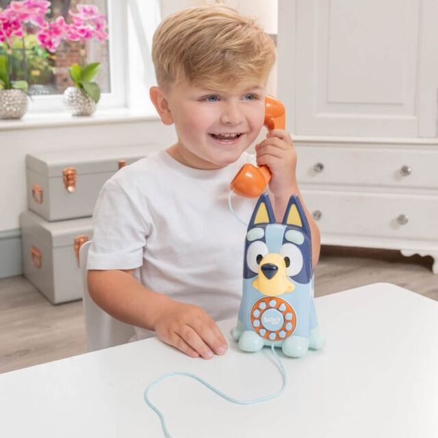 The Bluey shaped Telephone is perfect for Bluey fans! Pick the handset up when it rings. Press the large middle button to play the Bluey theme tune or ringing tone. Dial the numbers when the handset is down to hear all the favourite characters and dial the numbers when the handset is up to hear the Heeler family talking!