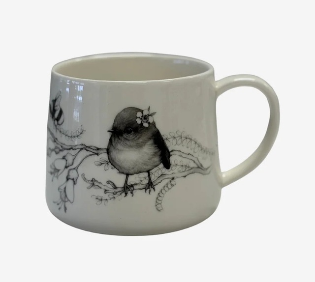 ‘So this is love’ features a male and female miromiro | tomtit pair, lovingly glancing at one another as they perch themselves amongst some flowering native puawānanga/clematis paniculata. They are also joined by a friendly pīrorohu/bumblebee. Miromiro/tomtits are charming little songbirds native to Aotearoa/New Zealand, known for their striking plumage and sweet, high-pitched calls. These birds often live in monogamous pairs, forming strong bonds that can last through multiple breeding seasons. During nesting, the male tomtit takes great care of his mate while the female stays on the nest to keep the eggs warm, the male brings her food like insects to help her stay strong. He stays nearby, often singing and watching for danger. After the chicks hatch, he helps feed them, working together with the female to raise their young. It's a beautiful example of teamwork in nature!
