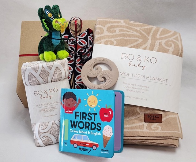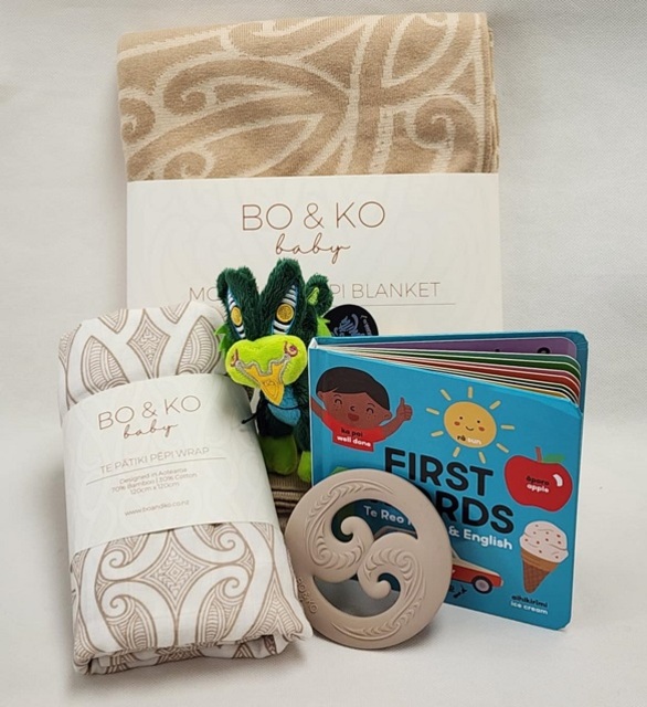 A thoughtfully chosen selection of Māori inspired baby gifts, beautifully presented in a natural gift box and finished off with a tāniko printed ribbon.