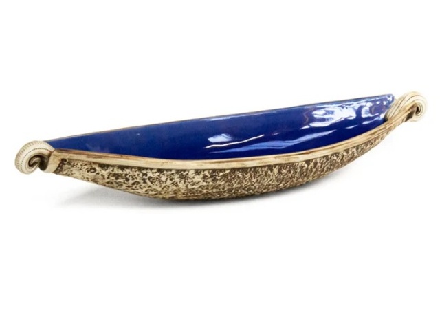 This long, sleek, ceramic bowl has the look of a waka. It has a scroll at each end and a textured finish on its underside. The rich blue finish inside is quietly sophisticated, and will look amazing in any room of the house.