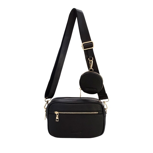 Oooh, we love the Ponsonby Crossbody Bag by Moana Road! It's small, compact, but surprisingly roomy. There are two main compartments, each with their own smaller internal pocket, and one outer pocket. As a fun bonus, there is a small matching coin purse. All zips are finished in a soft metallic gold, as are the clasps on the detachable, adjustable strap.