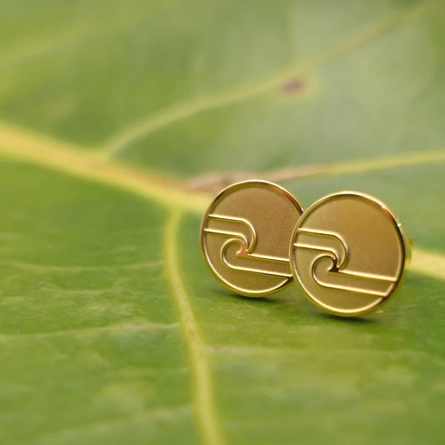 Small gold-plated stud earrings with Tino Rangatiratanga (Māori flag) imprinted on the circular face.