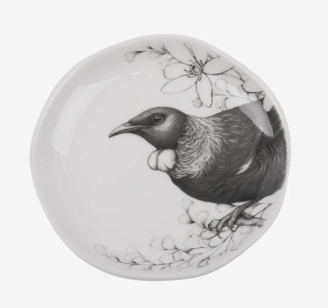 Trinket Dish ‘Home is here’, featuring a Tūī bird perched on a wave of Aotearoa, New Zealand native flora, including- Puawananga (clematis), Kawakawa, Mānuka and Kōwhai.